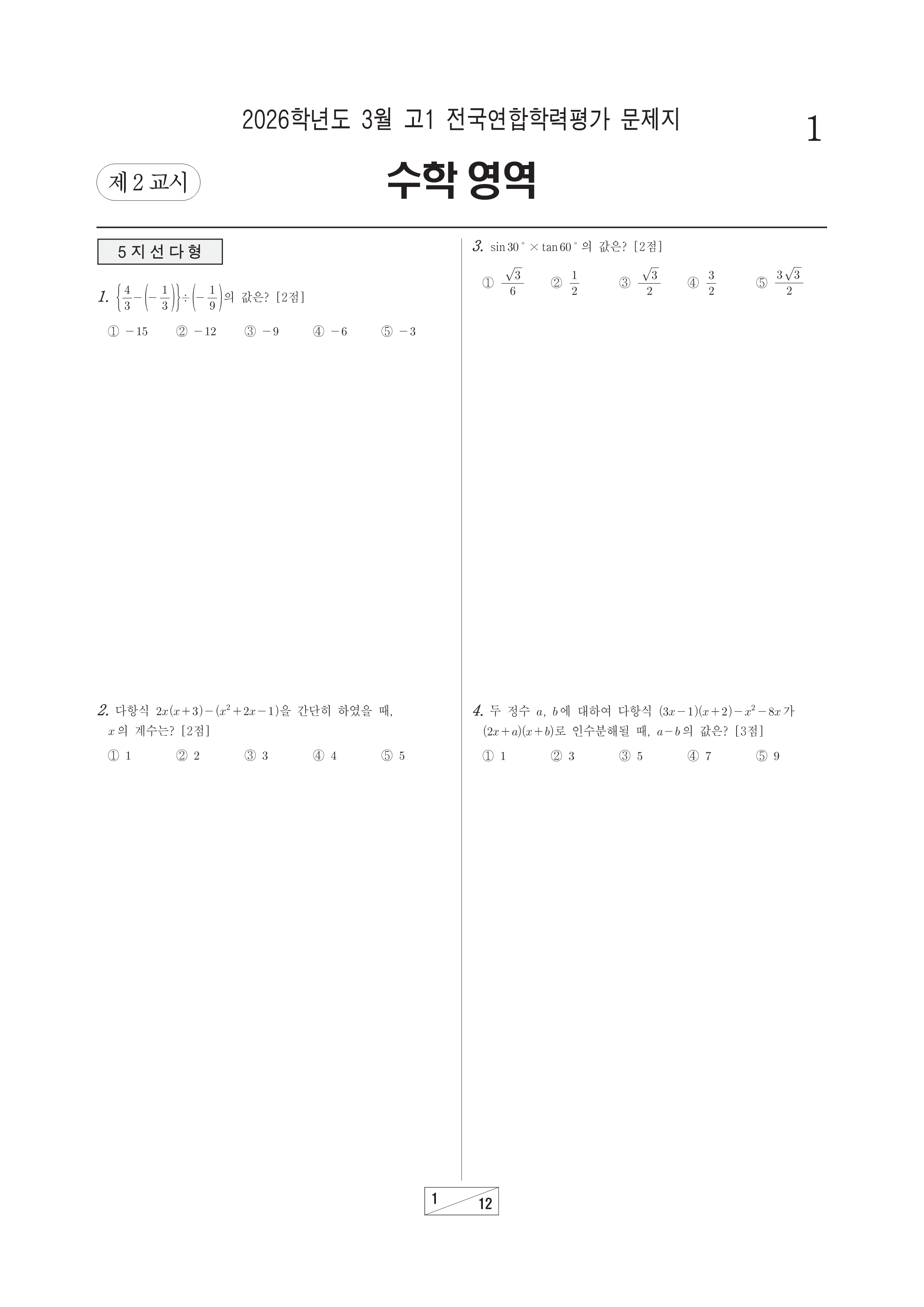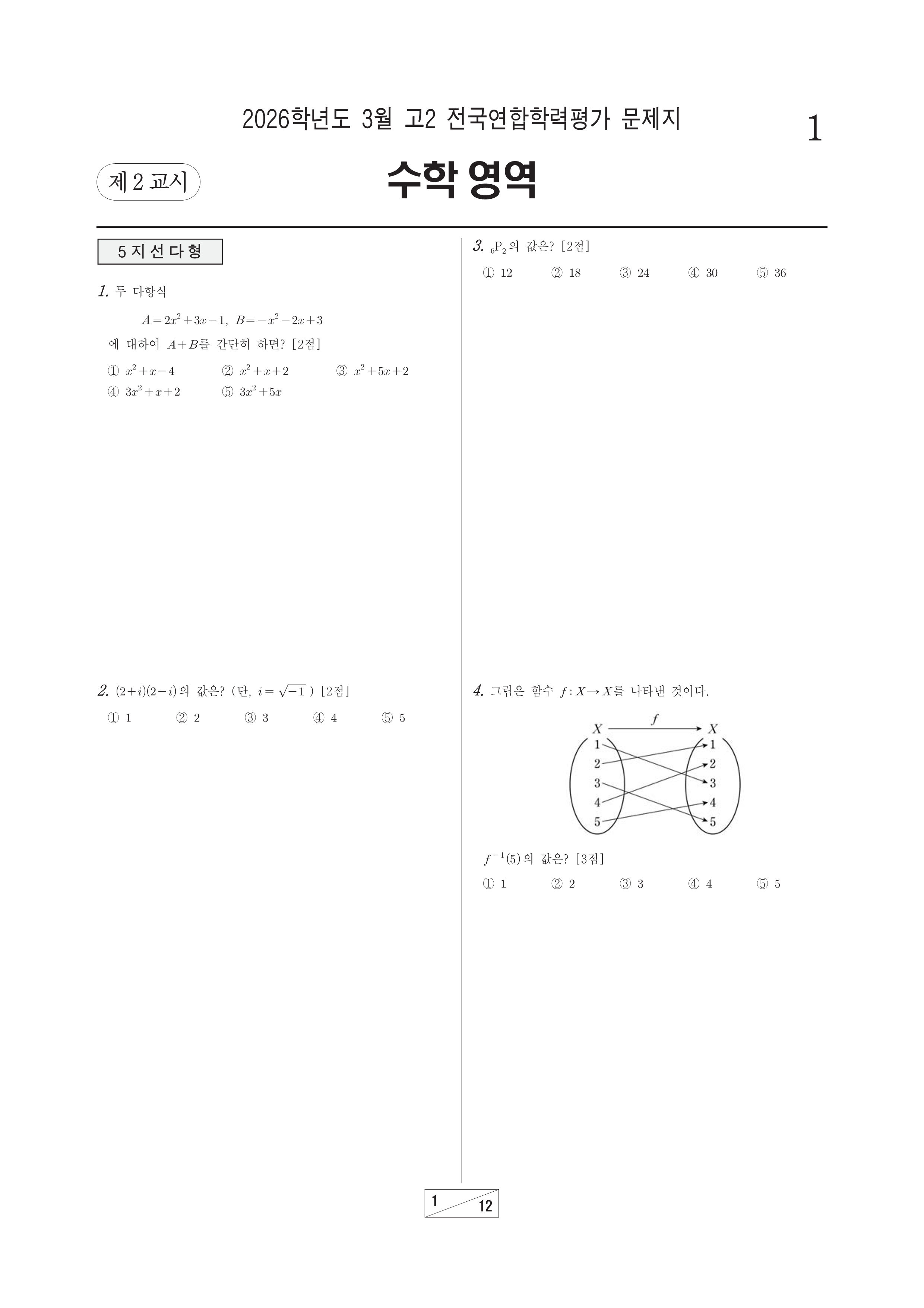 2026-03 고2 학평 수학 2026학년도 3월 고2 전국연합학력평가 수학시행 : 2026.03.24(화) 대상 : 고등학교 2학년출제 : 서울교육청 고2/수학 2026.03.24