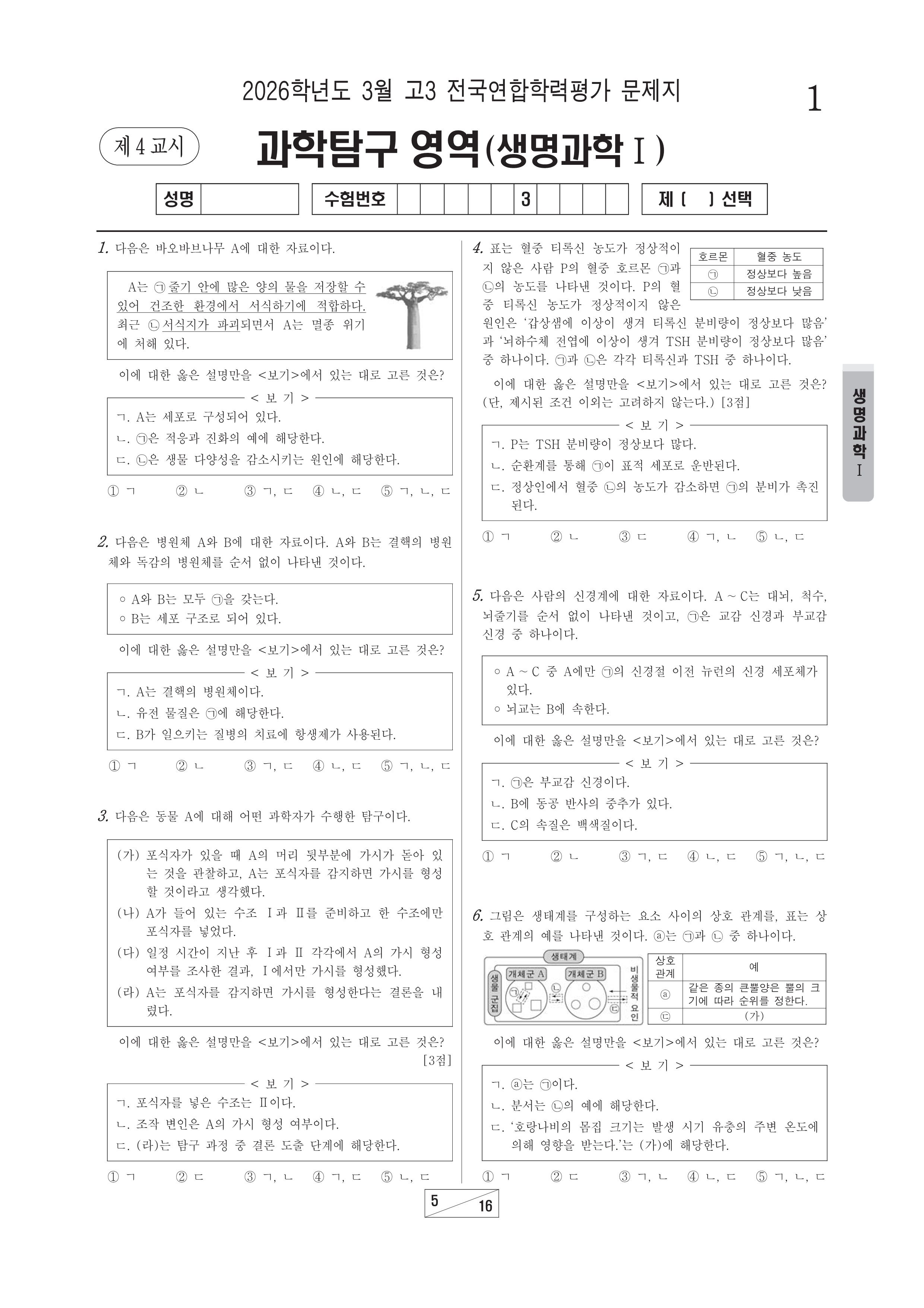 2026-03 고3 학평 과학(생명과학Ⅰ) 2026학년도 3월 고3 전국연합학력평가 과학(생명과학Ⅰ)시행 : 2026.03.24(화) 대상 : 고등학교 3학년출제 : 서울교육청 고3/과학 2026.03.24