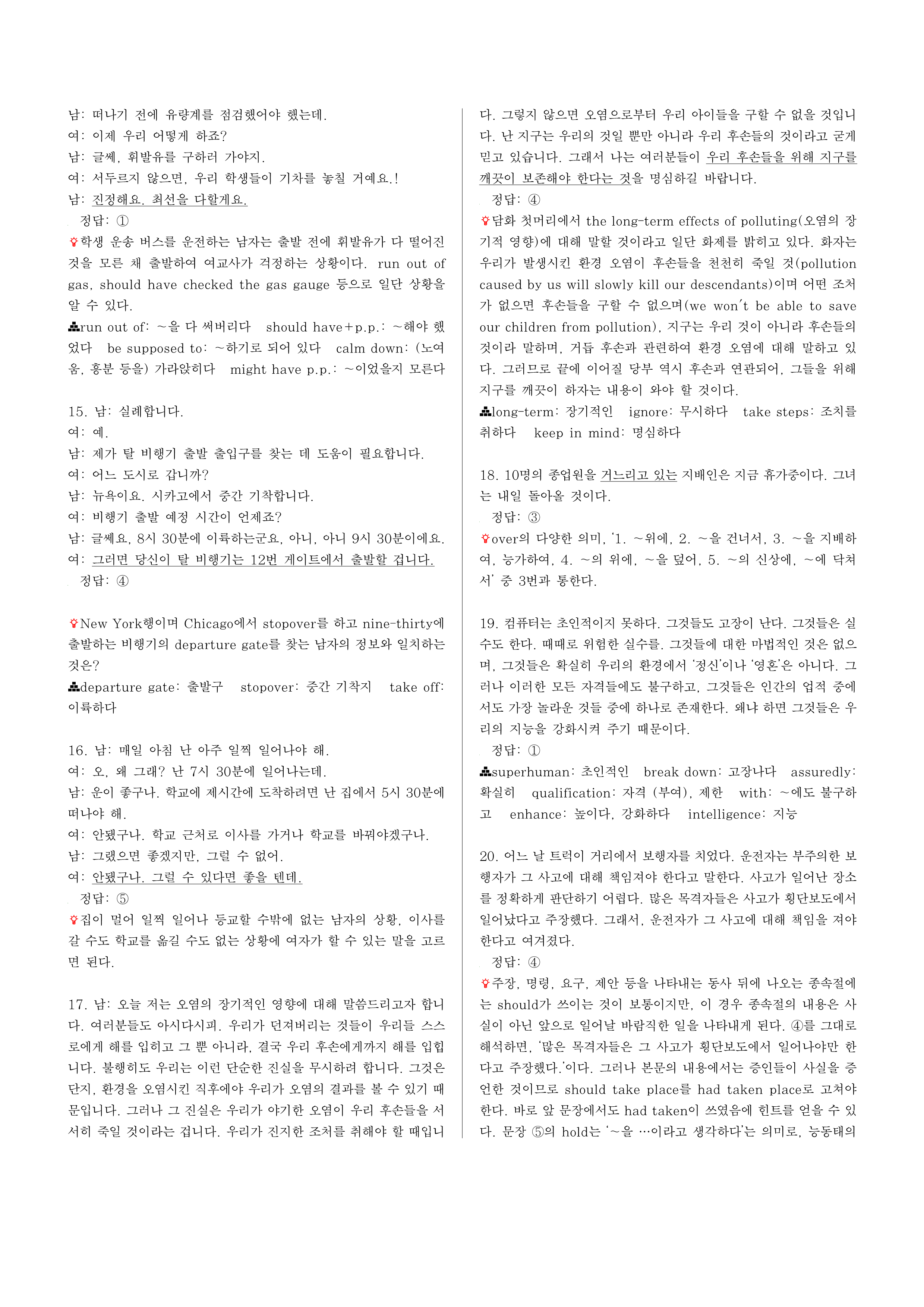 1번부터 17번까지는 듣고 답하는 문제입니다. 방송을 잘 듣고 답을 하기 바랍니다. 듣는 내용은 한 번만 방송됩니다.