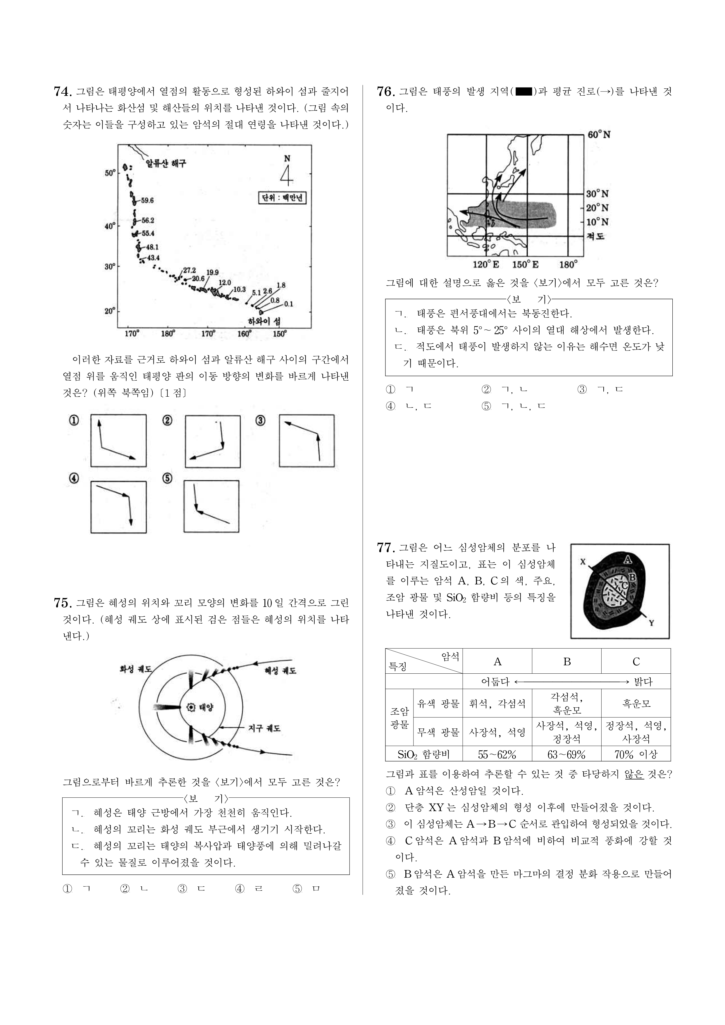 74. 그림은 태평양에서 열점의 활동으로 형성된 하와이 섬과 줄지어서 나타나는 화산섬 및 해산들의 위치를 나타낸 것이다. (그림 속의 숫자는 이들을 구성하고 있는 암석의 절대 연령을 나타낸 것이다.)