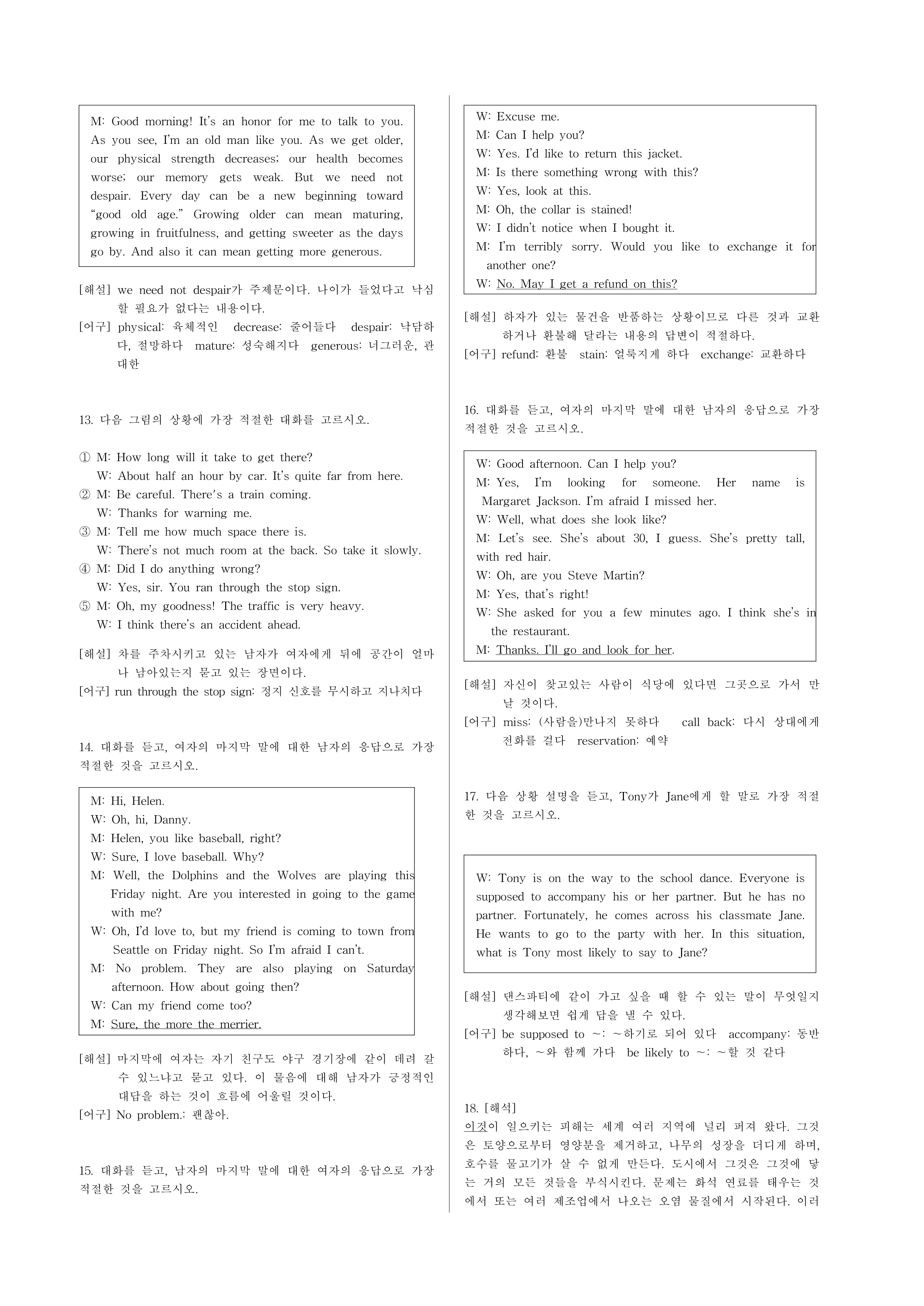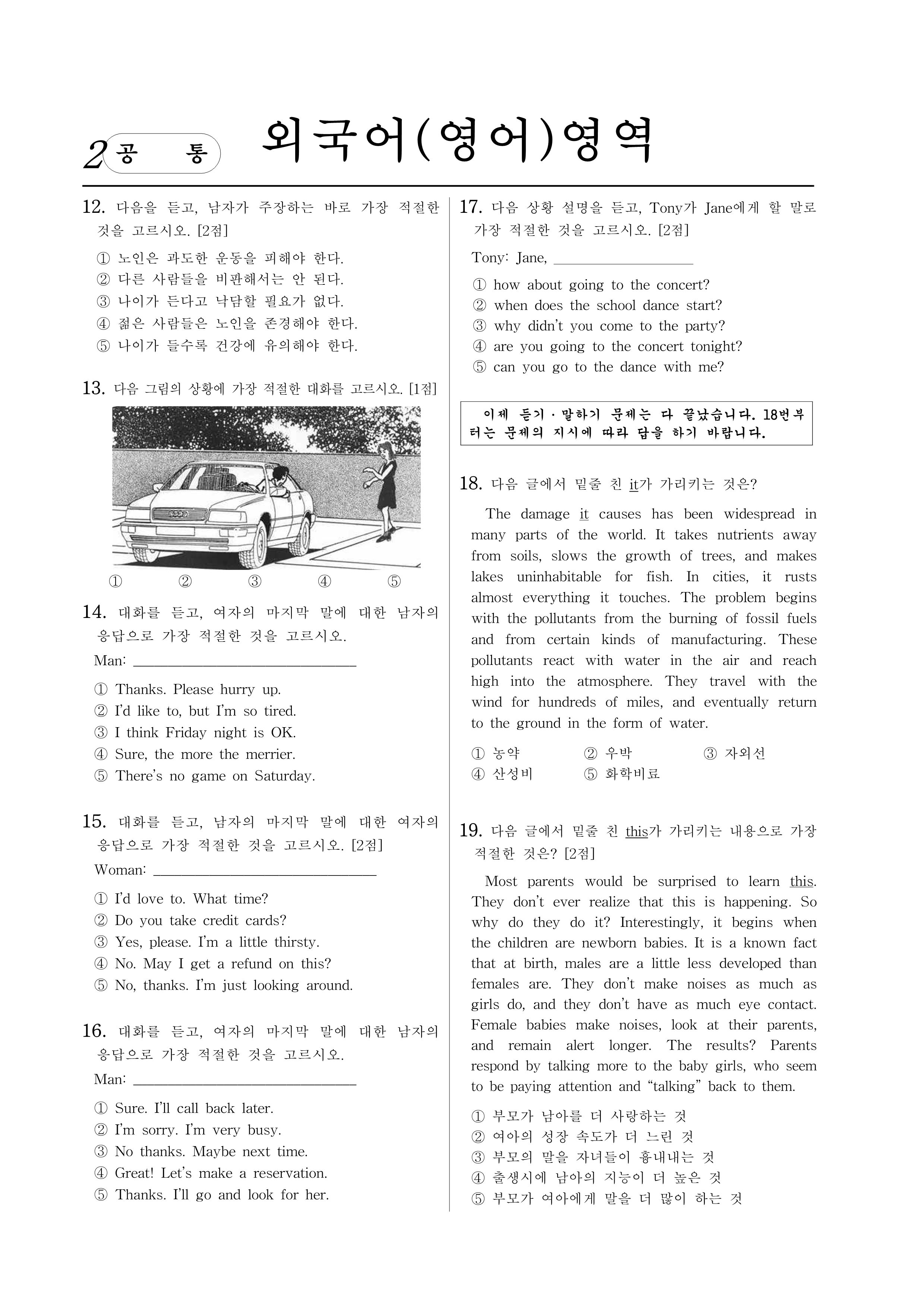 15. 대화를 듣고, 남자의 마지막 말에 대한 여자의 응답으로 가장 적절한 것을 고르시오. [2점]