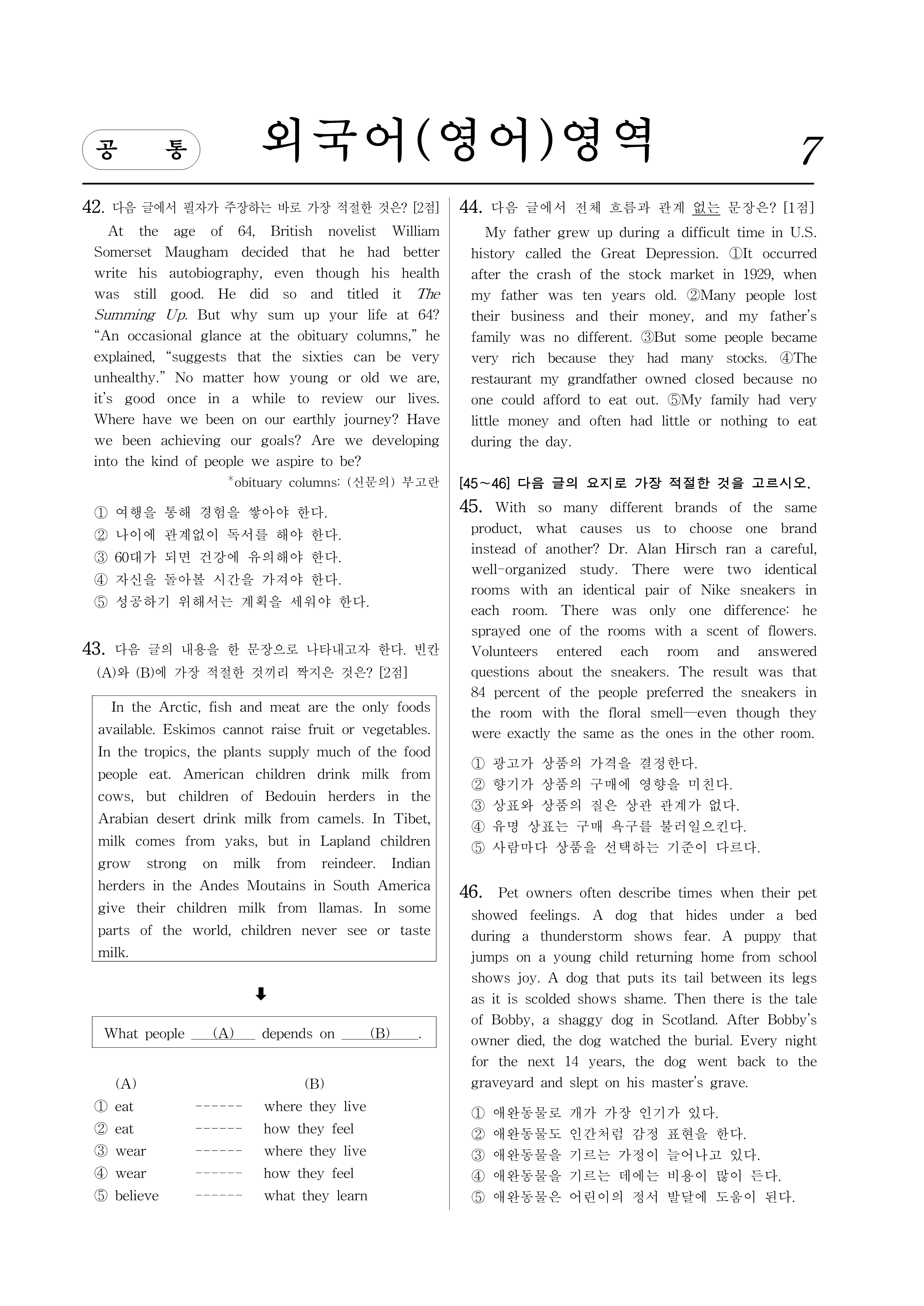 44. 다음 글에서 전체 흐름과 관계 없는 문장은? [1점]
