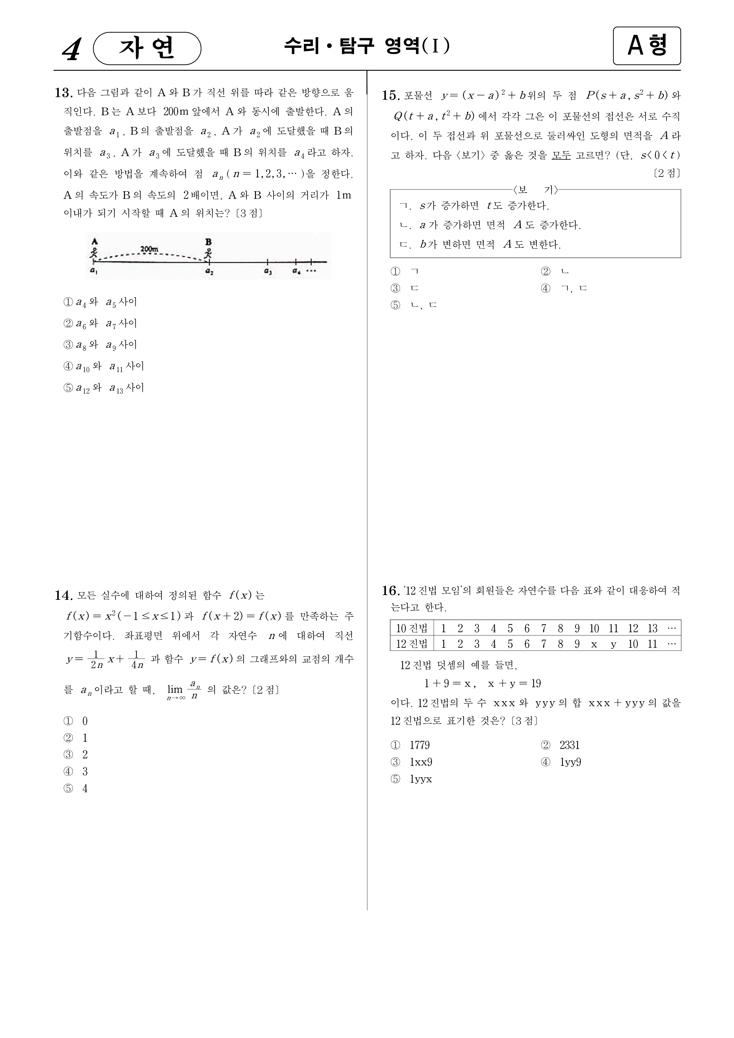 13. 다음 그림과 같이 $A$와 $B$가 직선 위를 따라 같은 방향으로 달린다. $B$는 $A$보다 $200$m 앞에서 $A$와 동시에 출발한다. $A$의 출발점을 $a_{1}$, $B$의 출발점을 $a_{2}$, $A$가 $a_{2}$에 도달했을 때 $B$의 위치를 $a_{3}$, $A$가 $a_{3}$에 도달했을 때 $B$의 위치를 $a_{4}$라고 하자. 이와 같은 방법으로 계속하여 점 $a_{n}$ ($n=1$, $2$, $3$, $\cdots$)을 정한다. $A$의 속도가 $B$의 속도의 $2$배이면, $A$와 $B$ 사이의 거리가 $1$m 이내가 되기 시작할 때 $A$의 위치는?