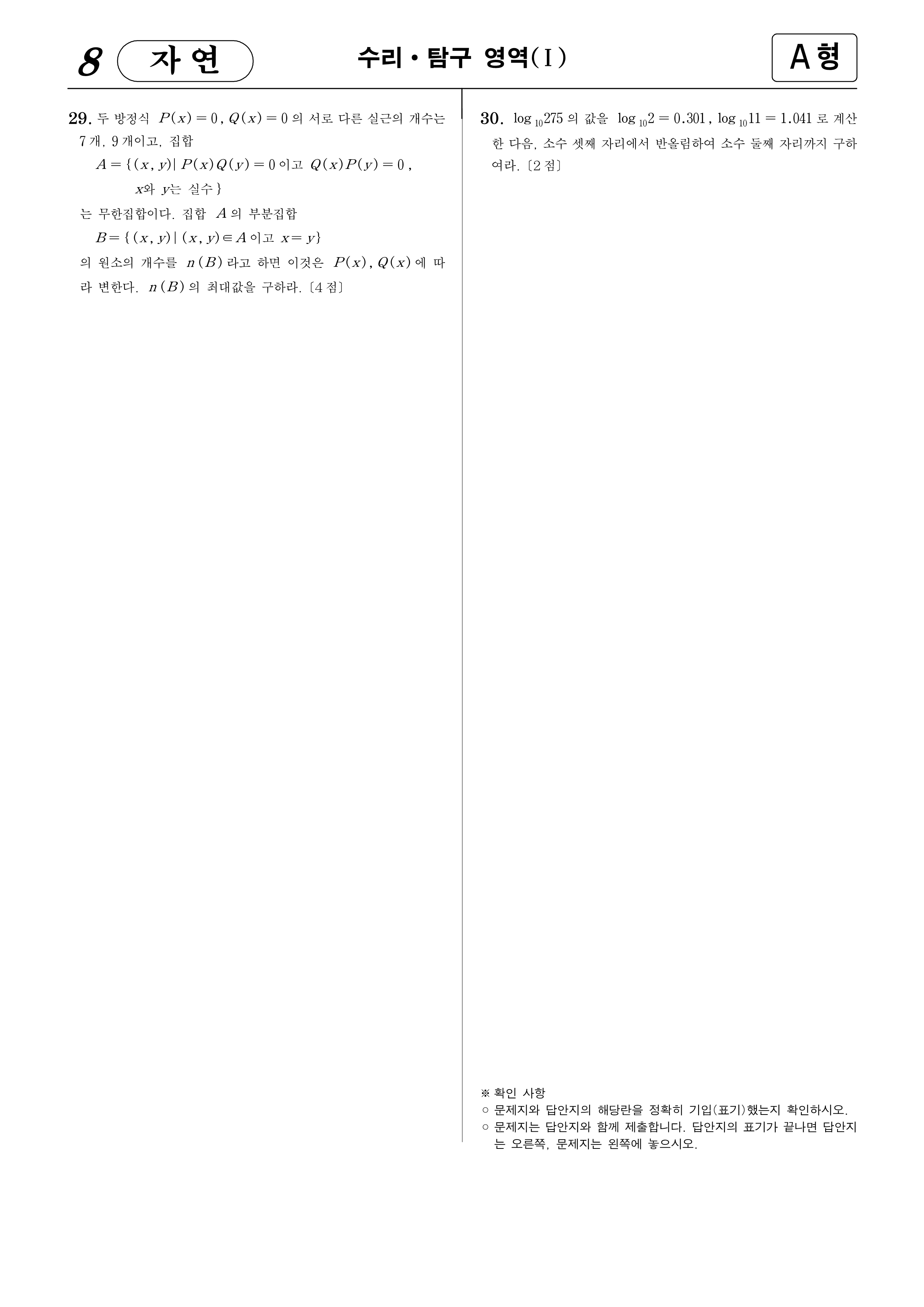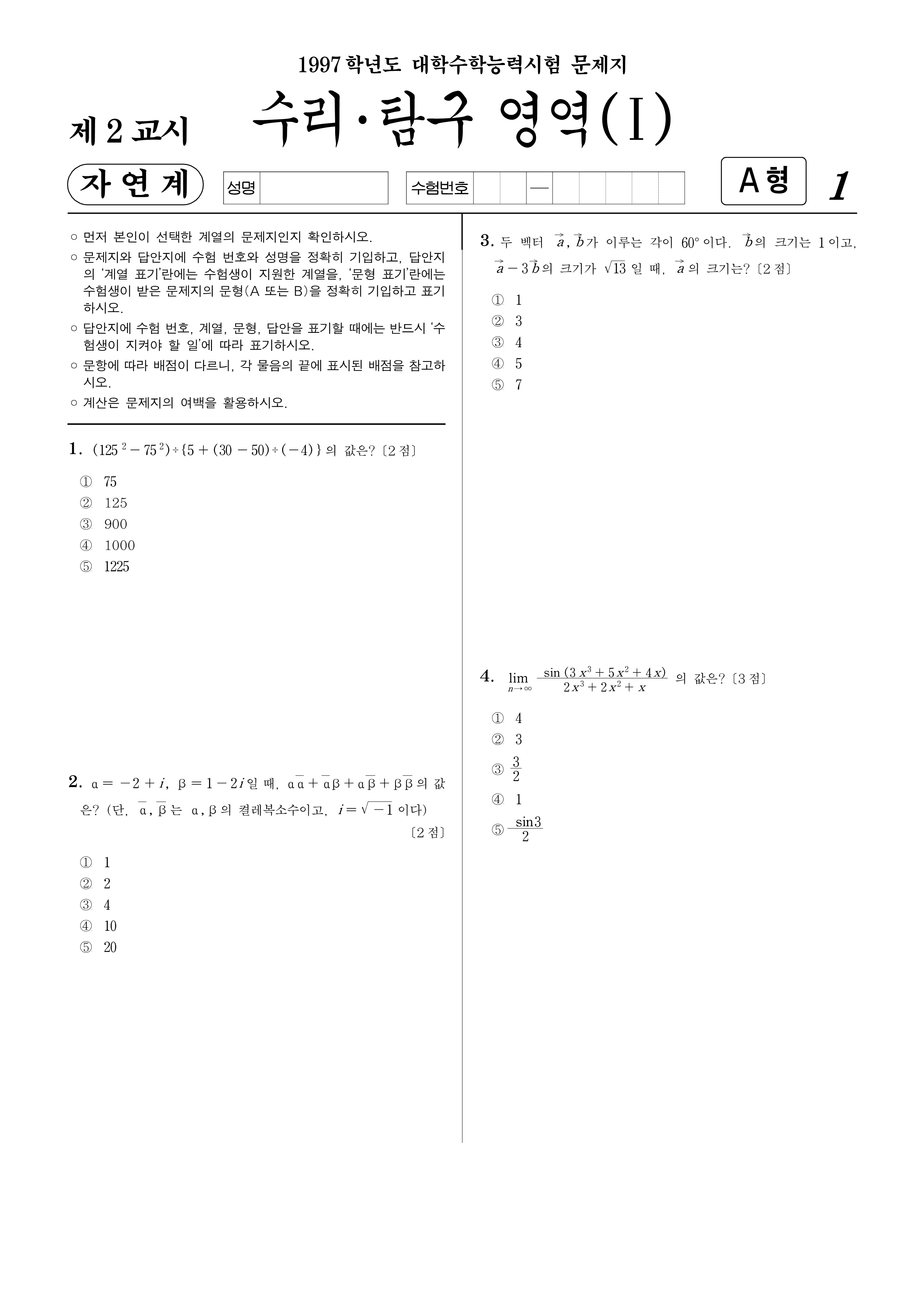 1997학년도 대학수학능력시험 수학(자연계)
