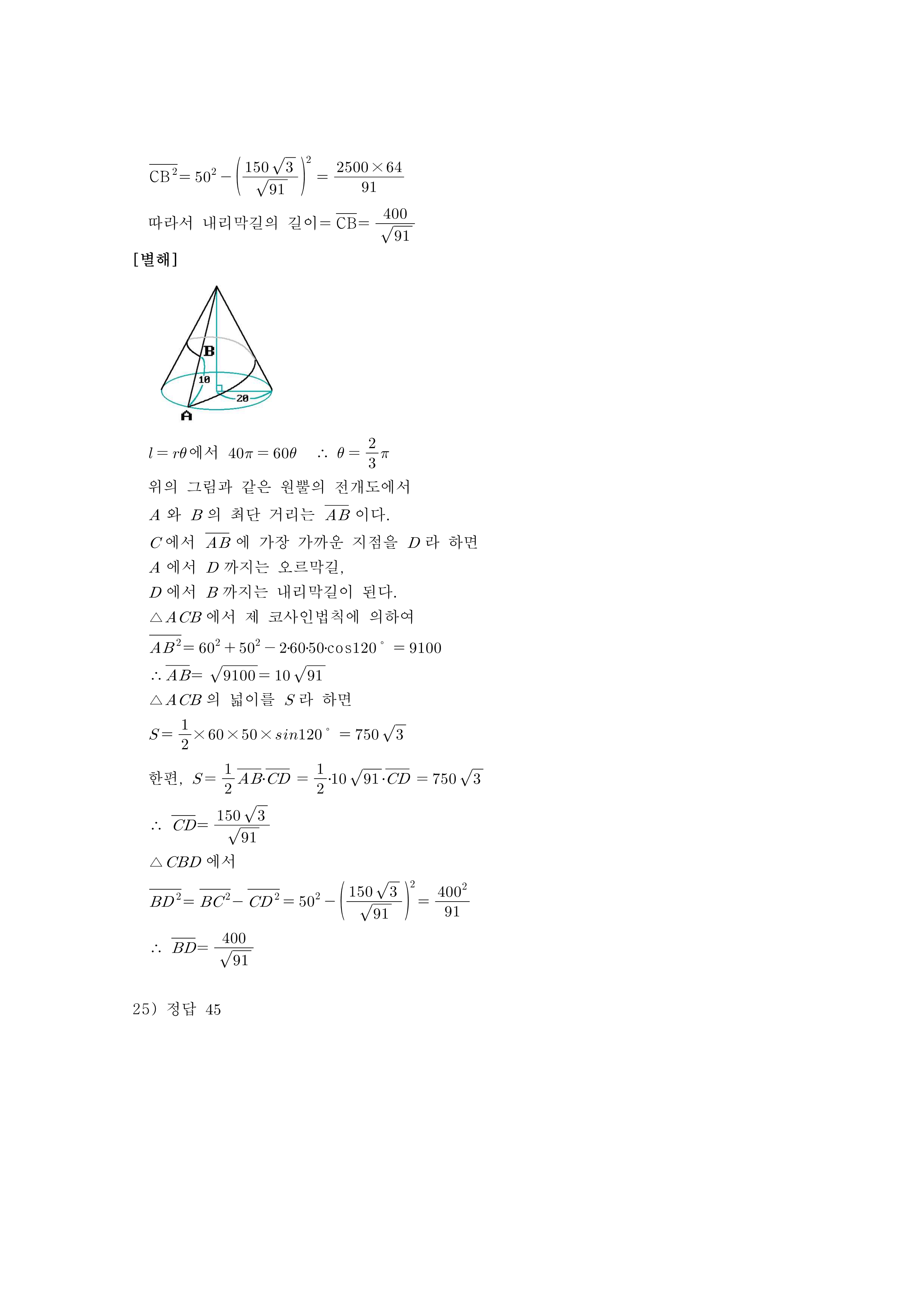 24. 오른쪽 그림과 같은 직원뿔 모양의 산이 있다. $A$지점을 출발하여 산을 한 바퀴 돌아 $B$지점으로 가는 관광 열차의 궤도를 최단거리로 놓으면, 이 궤도는 처음에는 오르막길이지만 나중에는 내리막길이 된다. 이 내리막길의 길이는?
