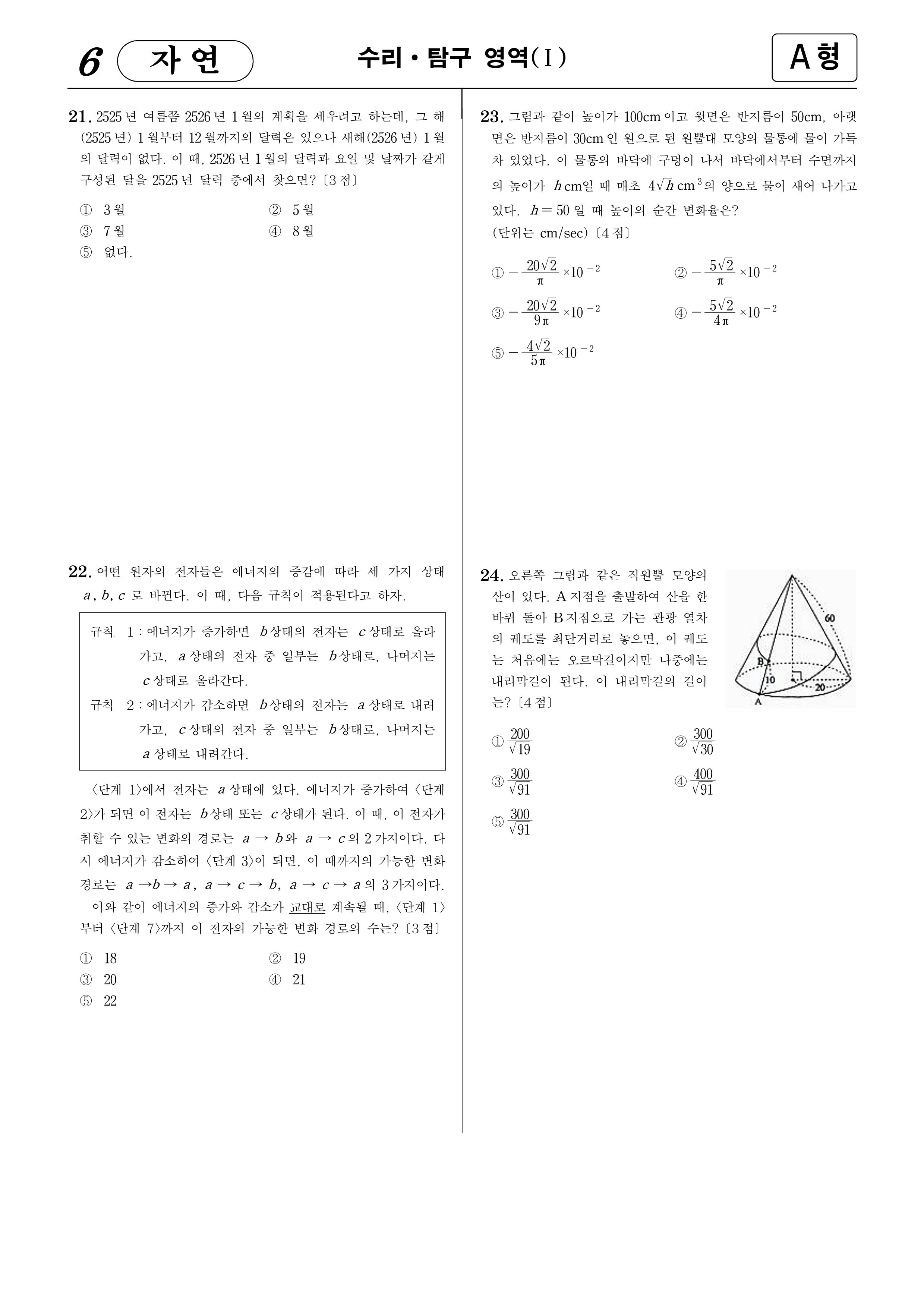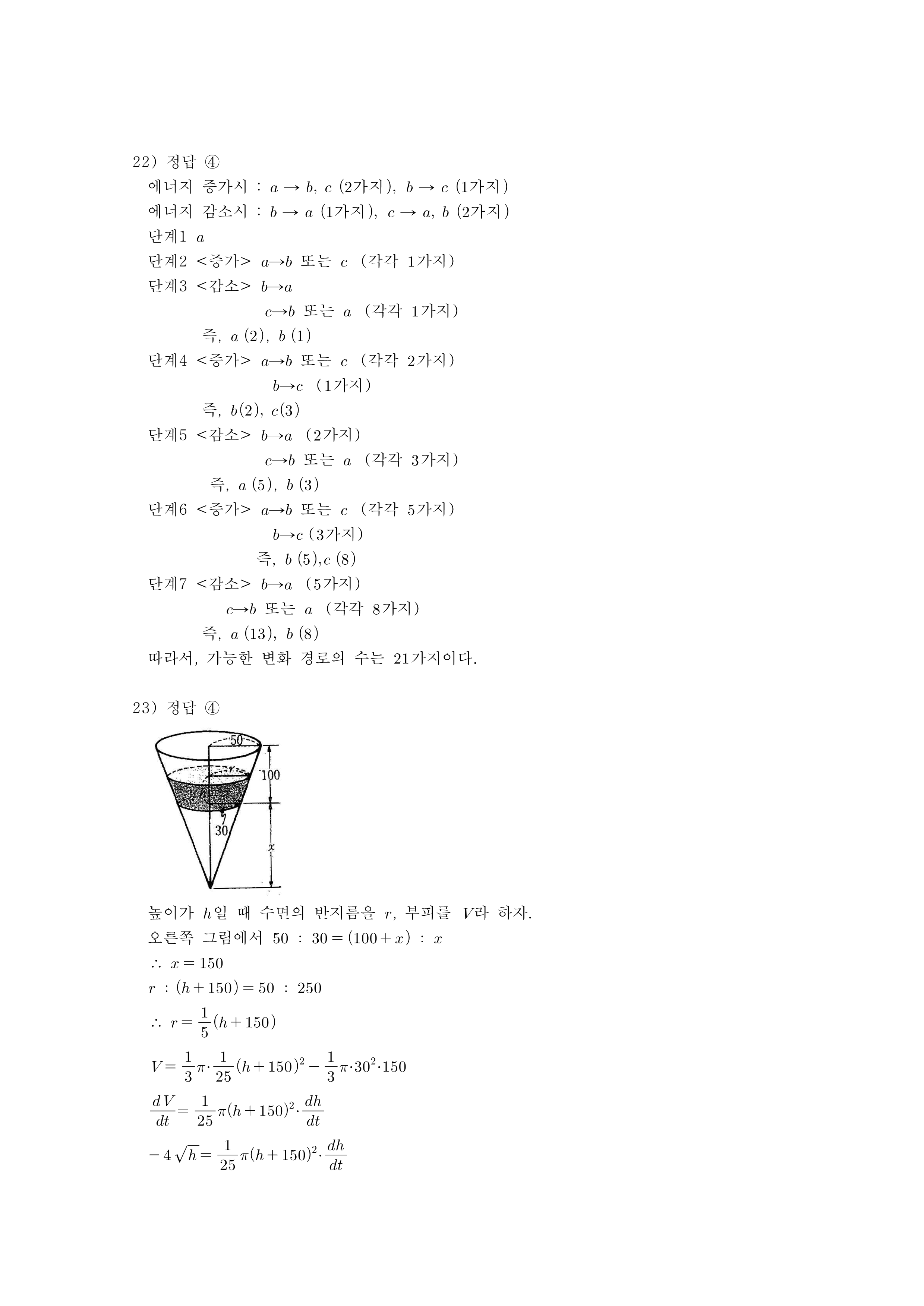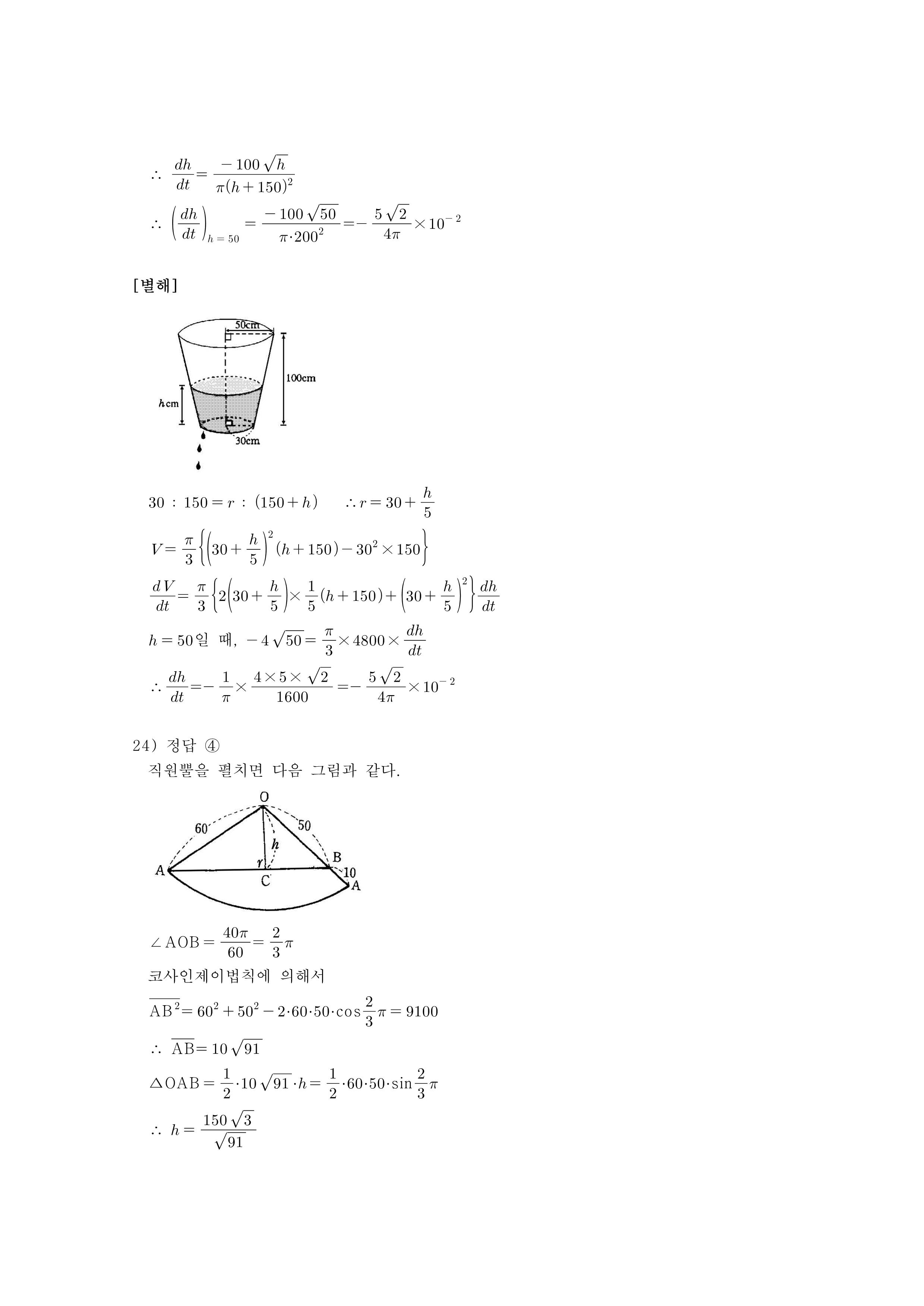 23. 그림과 같이 높이가 $100$cm이고 윗면은 반지름이 $50$cm, 아랫면은 반지름이 $30$cm인 원으로 된 원뿔대 모양의 물통에 물이 가득차 있었다. 이 물통의 바닥에 구멍이 나서 바닥에서부터 수면까지의 높이가 $h$cm일 때, 매초 $4 \sqrt{h}\text{cm}^{3}$의 양으로 물이 새어 나가고 있다. $h=50$일 때 높이의 순간변화율은? (단위는 cm/sec)