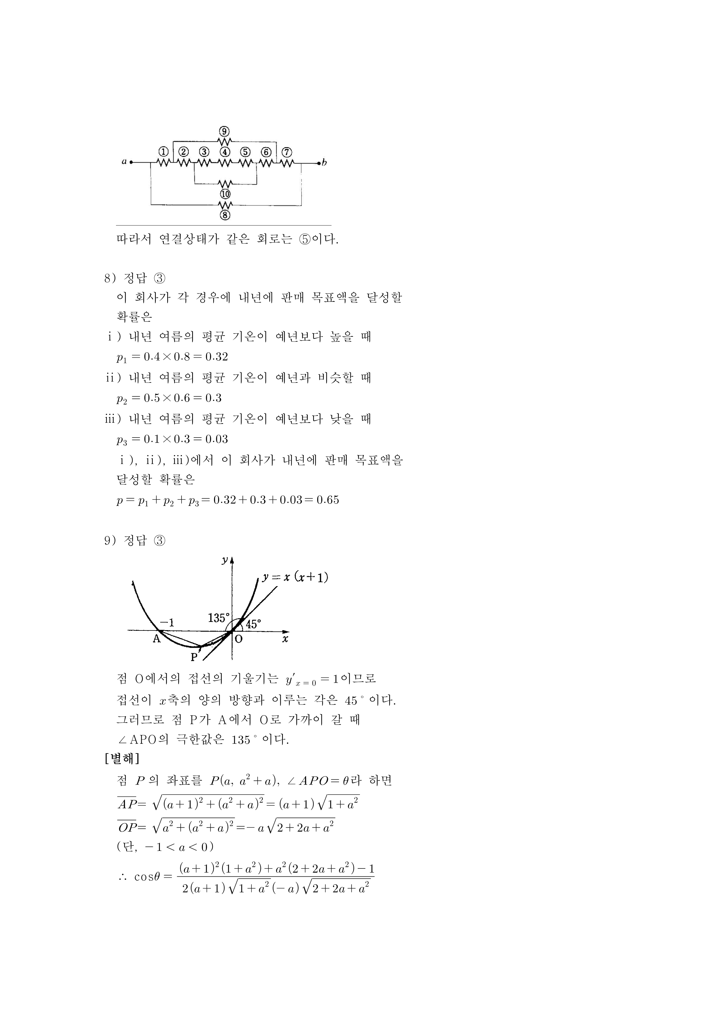 9. 포물선 $y=x (x+1)$ 위에 점 $A(-1, 0)$이 있다. 점 $P$가 점 $A$에서 포물선을 따라 원점 $O$로 한없이 가까이 갈 때, $\angle APO$의 크기의 극한값은?