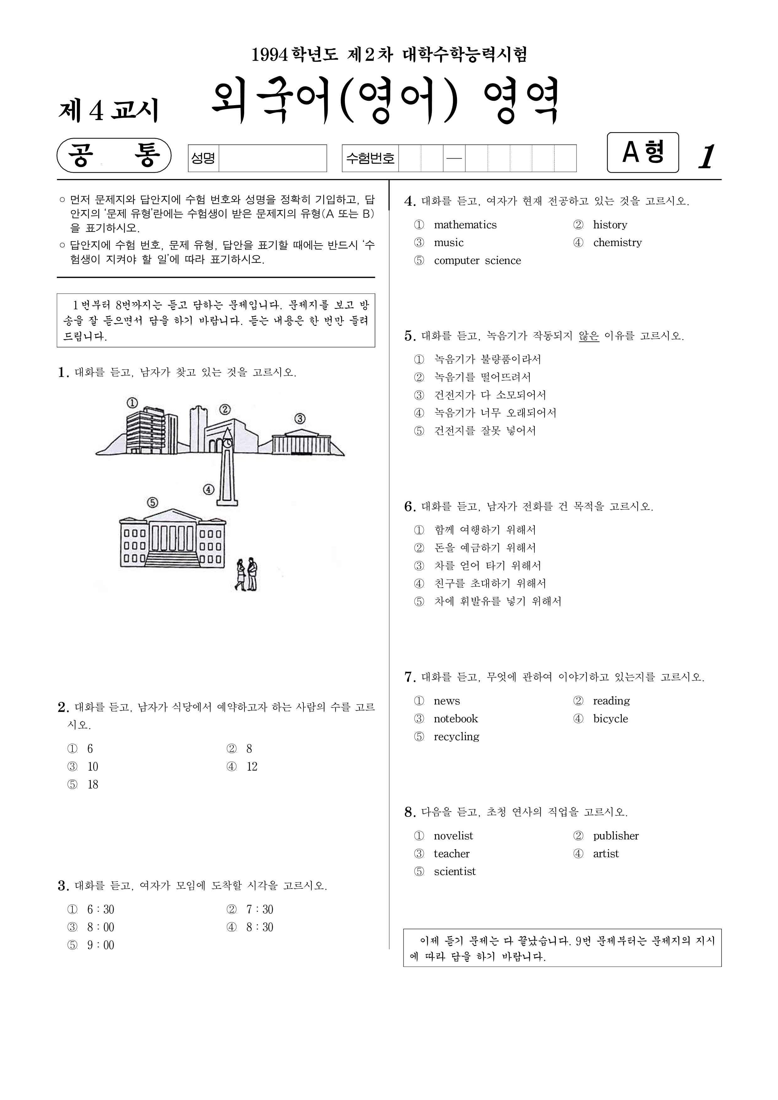 1번부터 8번까지는 듣고 답하는 문제입니다. 문제지를 보고 방송을 잘 듣으면서 답을 하기 바랍니다. 듣는 내용은 한 번만 들려 드립니다.