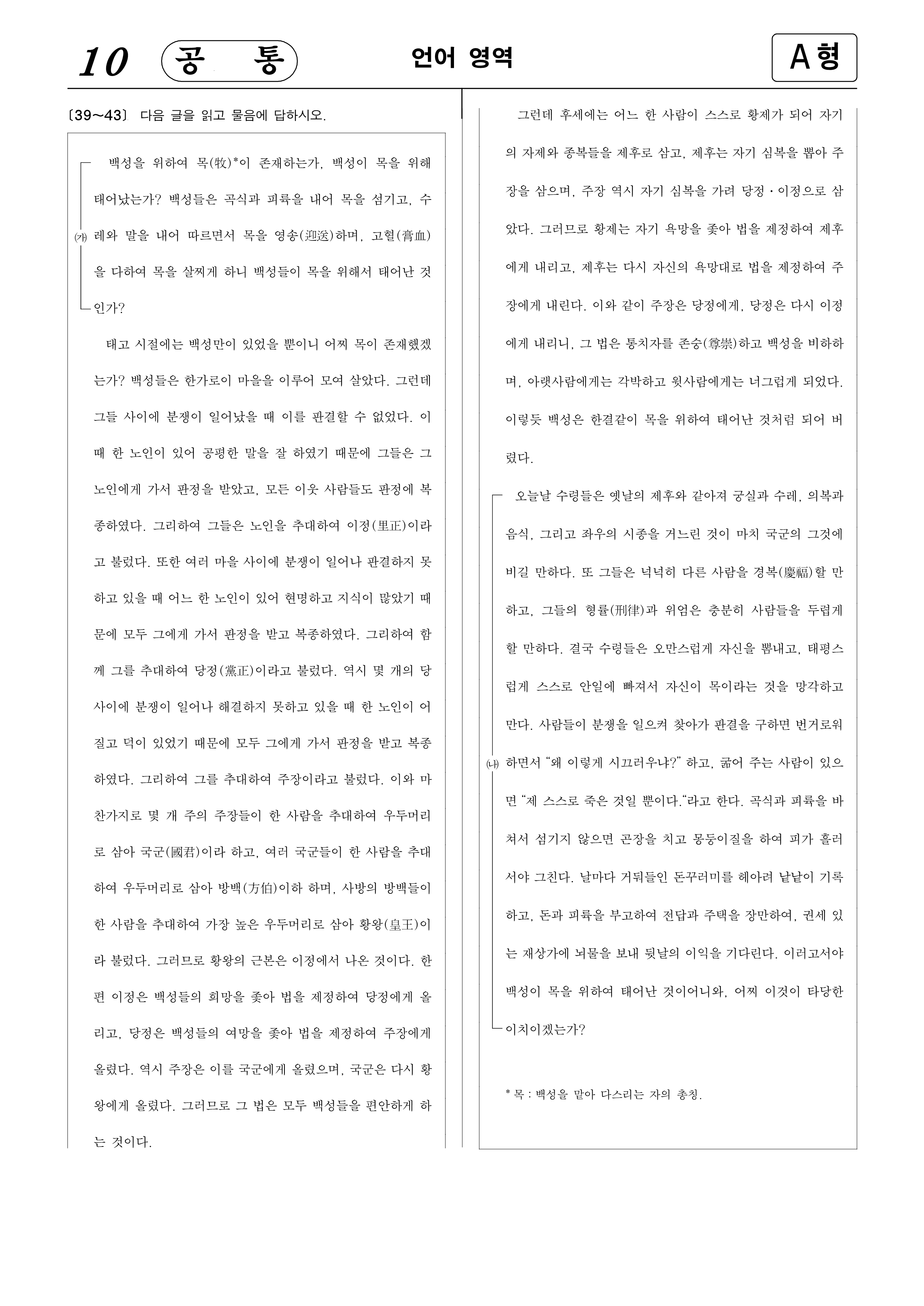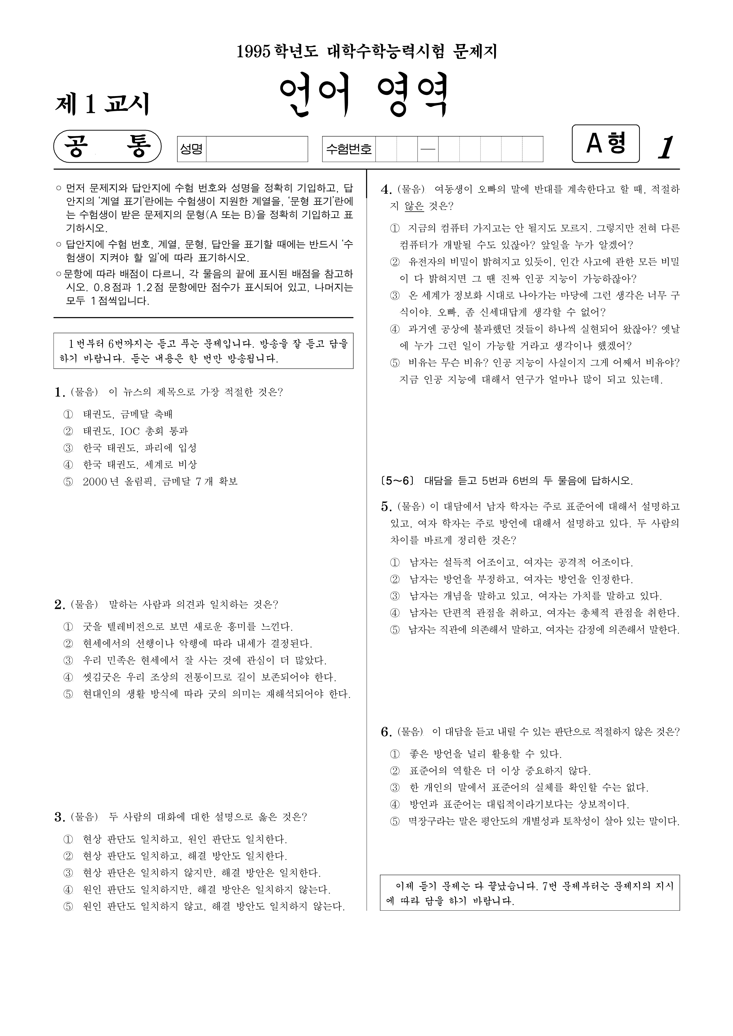 이제 듣기 문제는 다 끝났습니다. 7번 문제부터는 문제지의 지시에 따라 답을 하기 바랍니다.