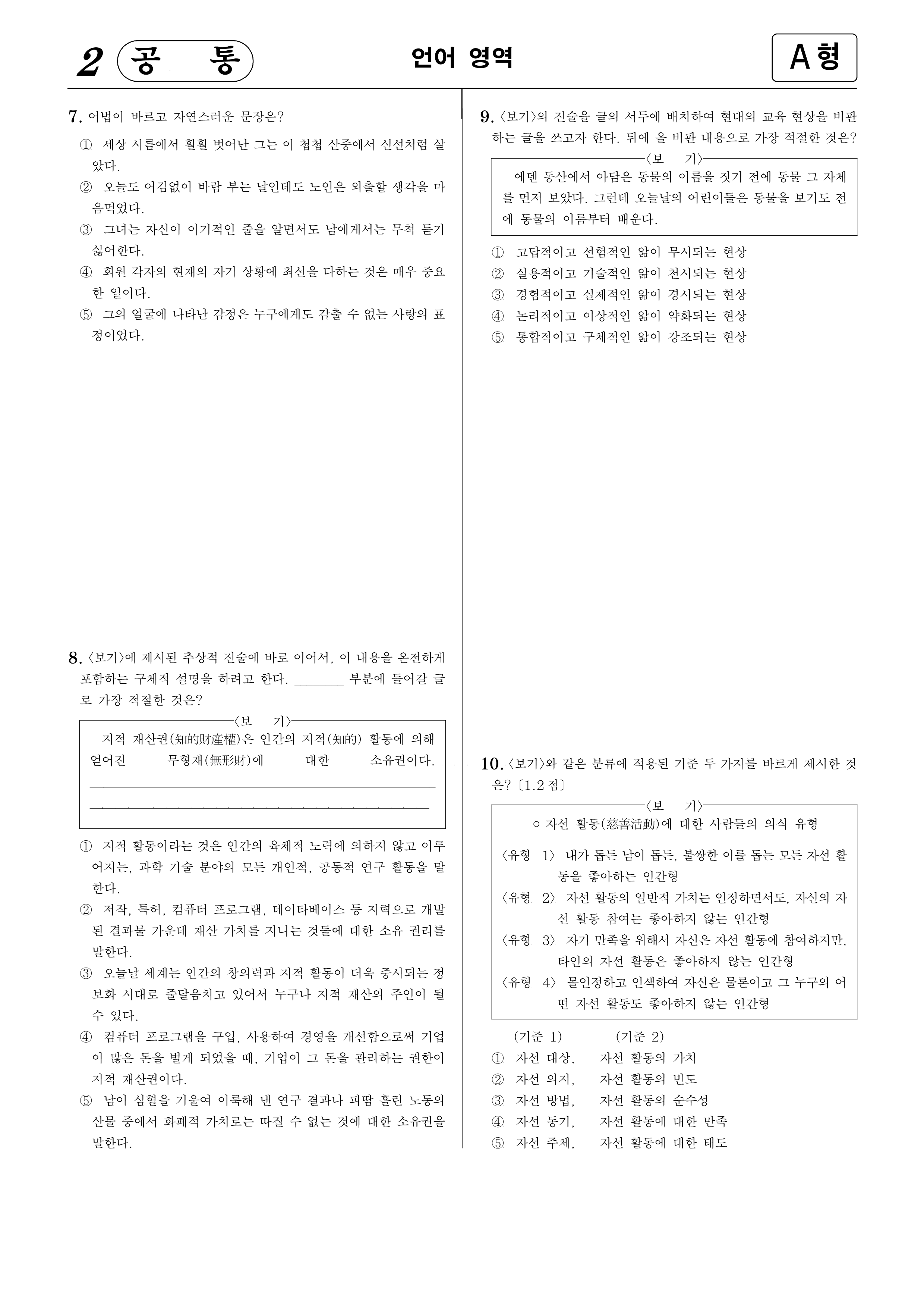 10. <보기>와 같은 분류에 적용된 기준 두 가지를 바르게 제시한 것은? [1.2점]