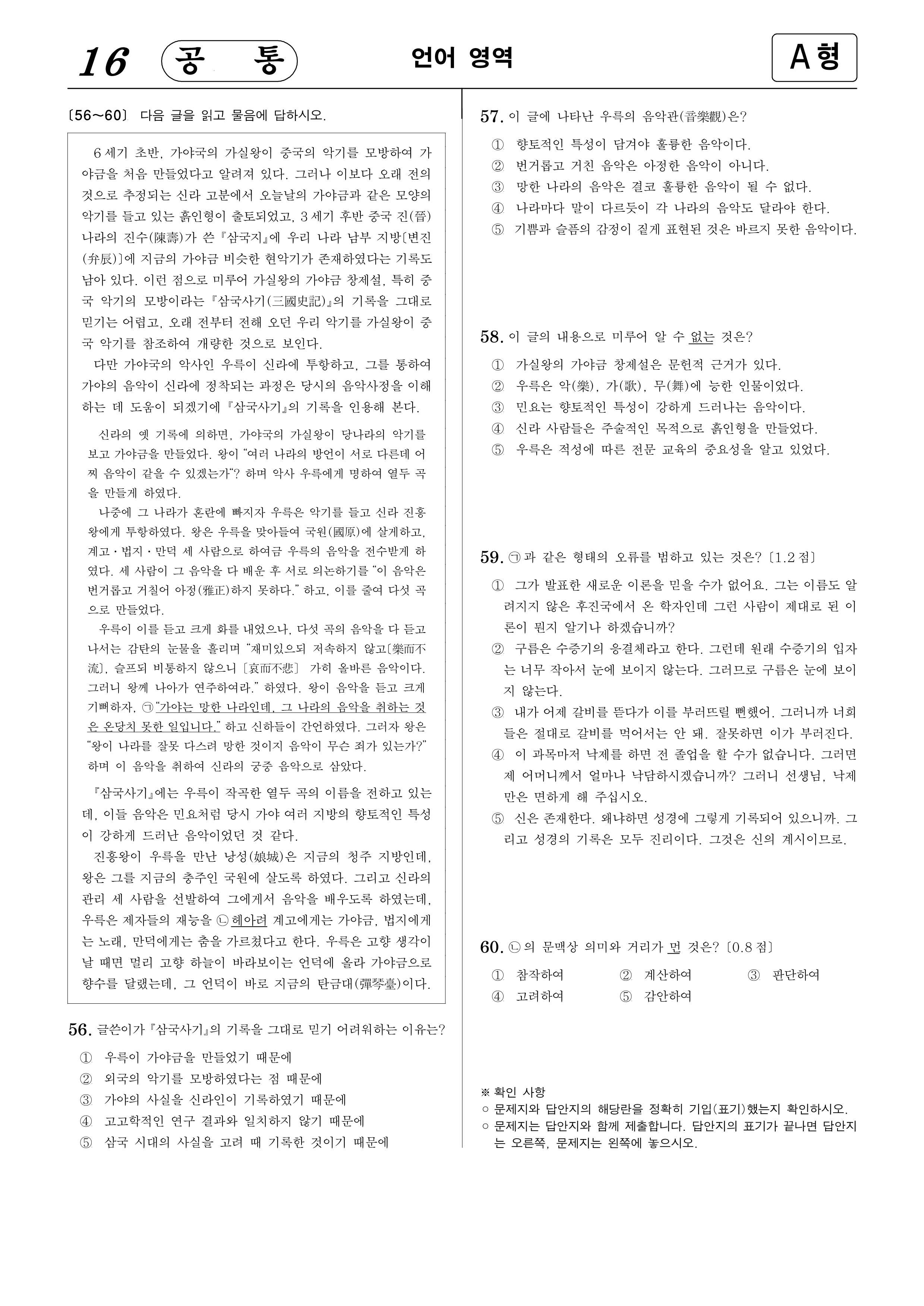 57. 이 글에 나타난 우륵의 음악관(音樂觀)은?