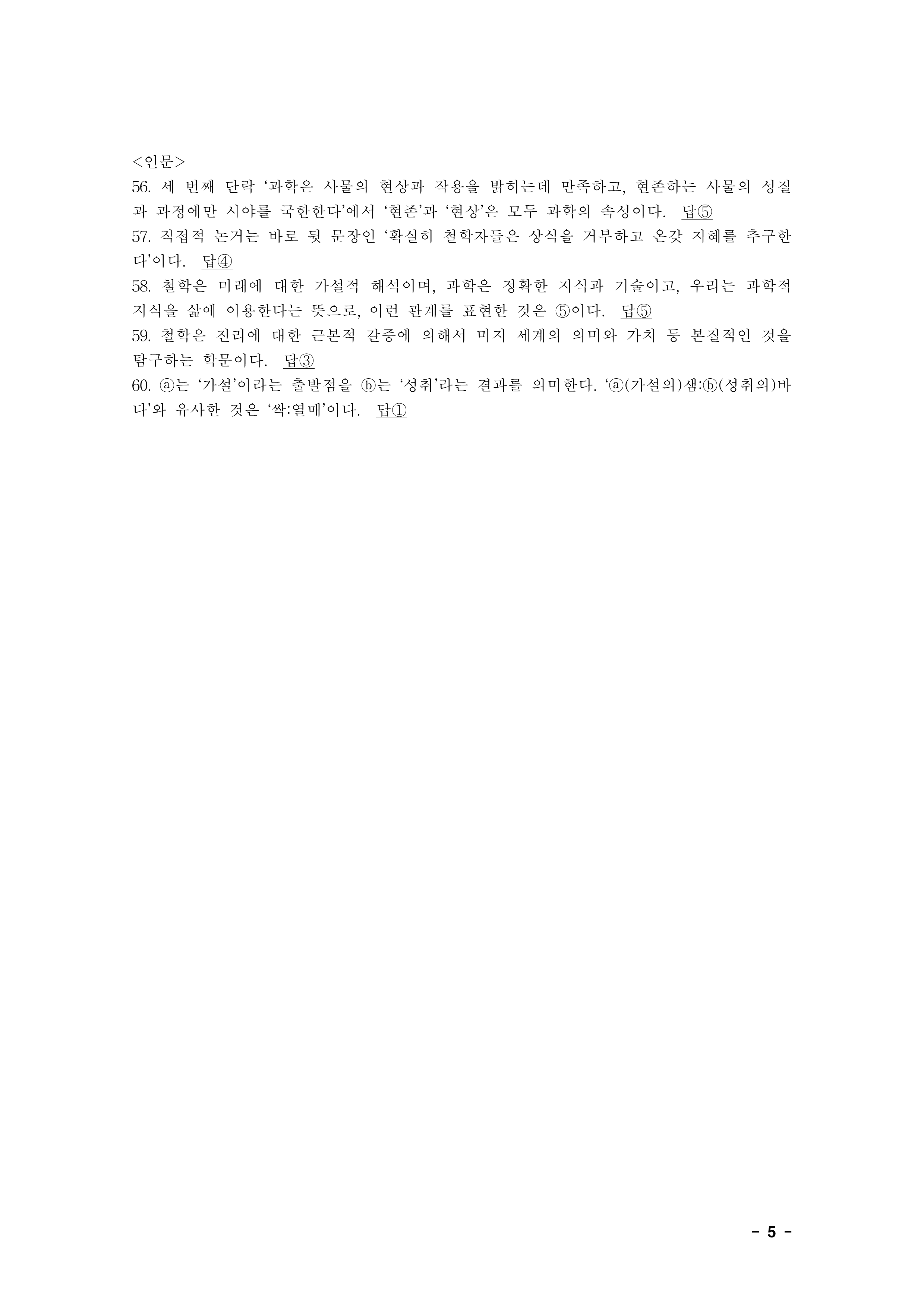 56. 윗글의 내용으로 미루어 ‘과학’과 ‘철학’의 대비적 속성을 잘못 짝지은 것은?