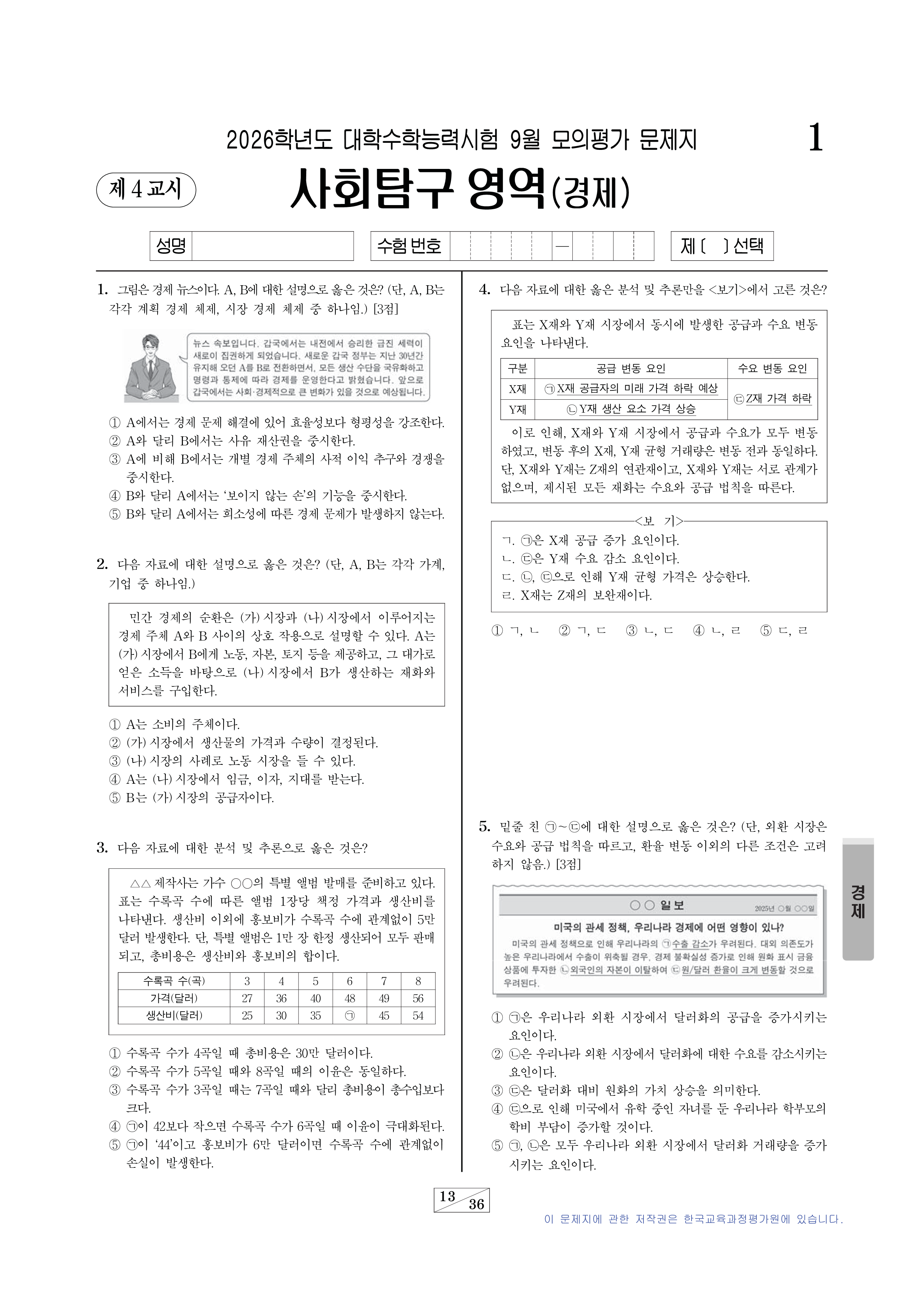 2026학년도 대학수학능력시험 9월 모의평가 사회(경제)