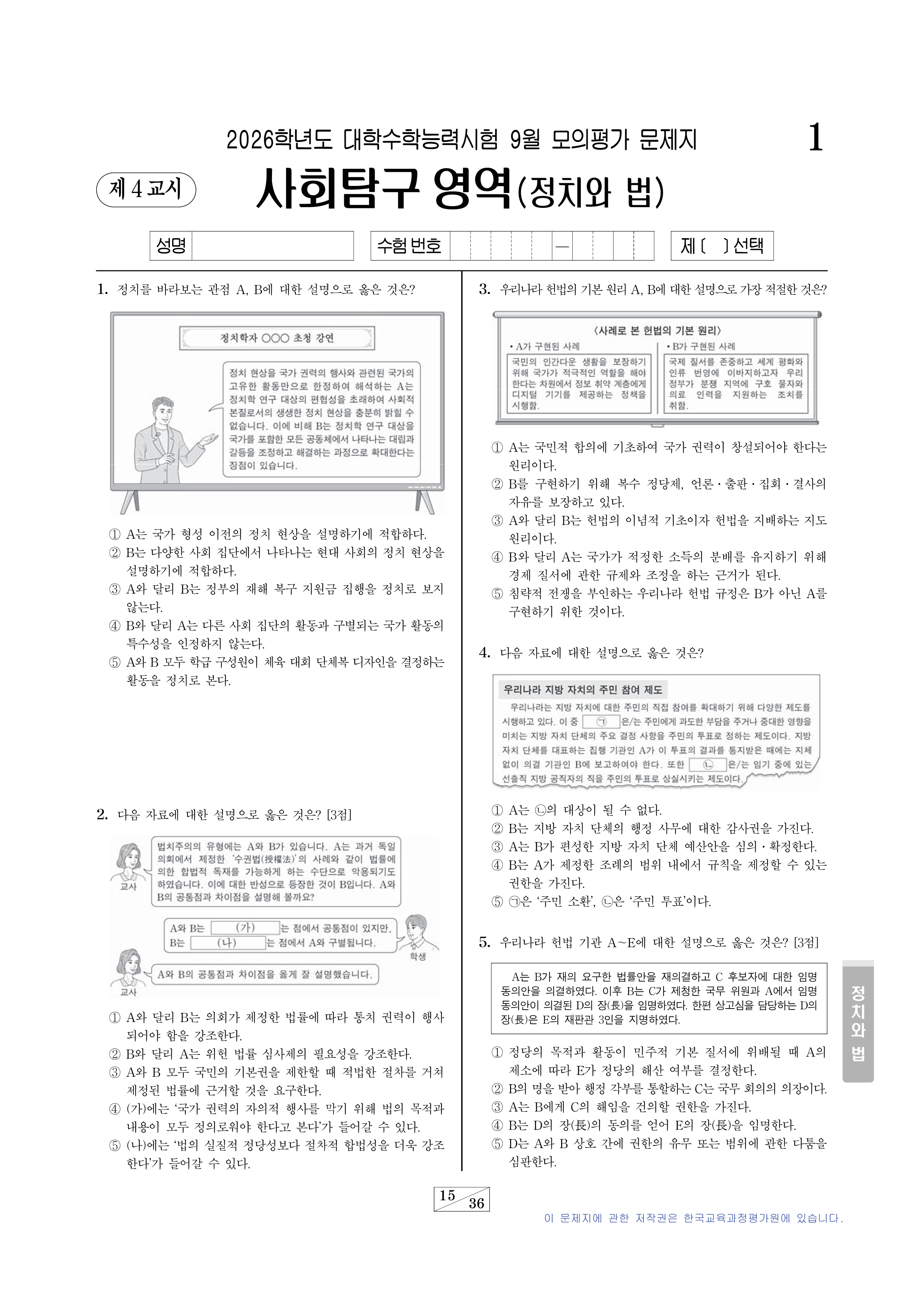 2026학년도 대학수학능력시험 9월 모의평가 사회(정치와 법)