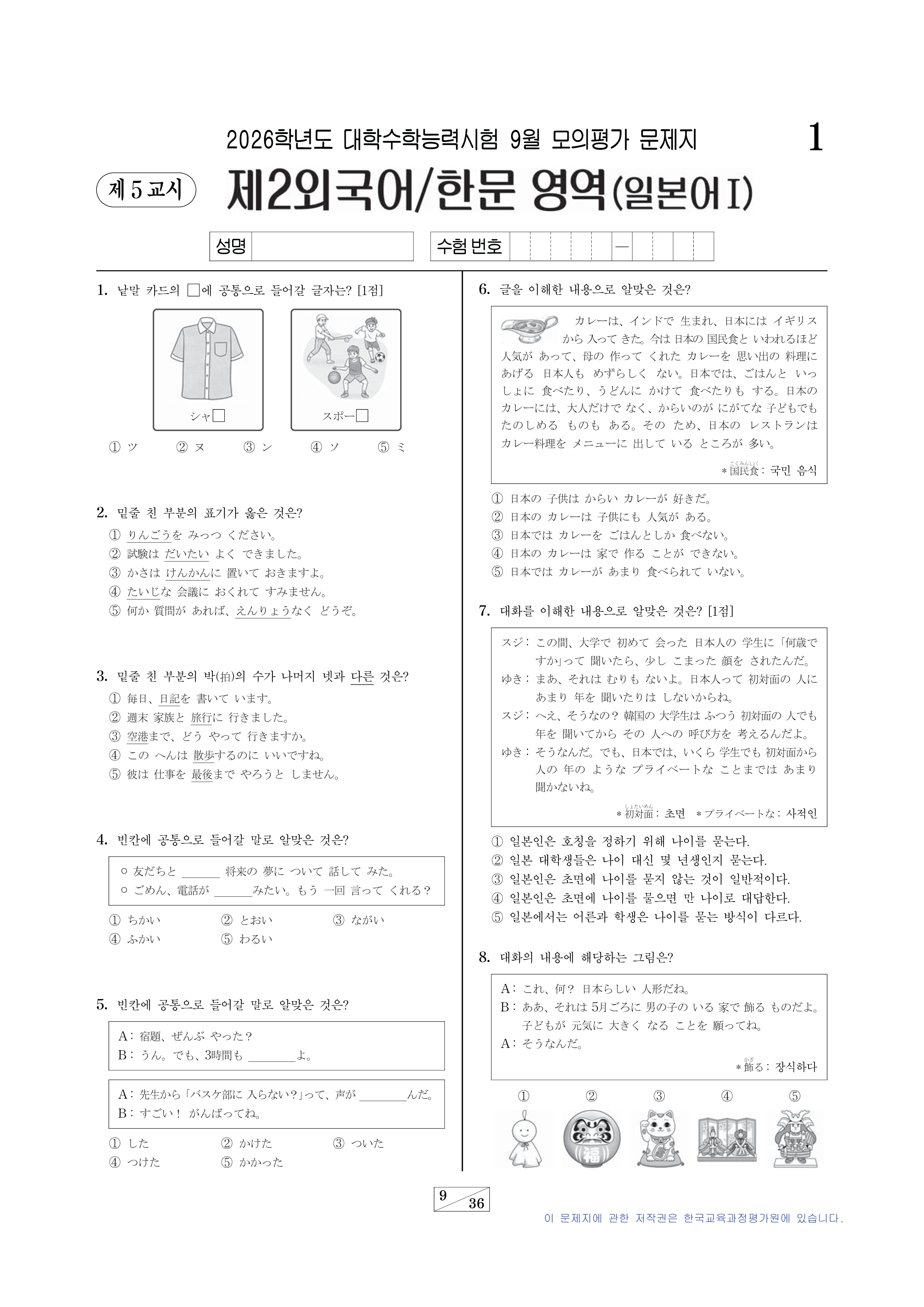 2026학년도 대학수학능력시험 9월 모의평가 제2외국어(일본어Ⅰ)