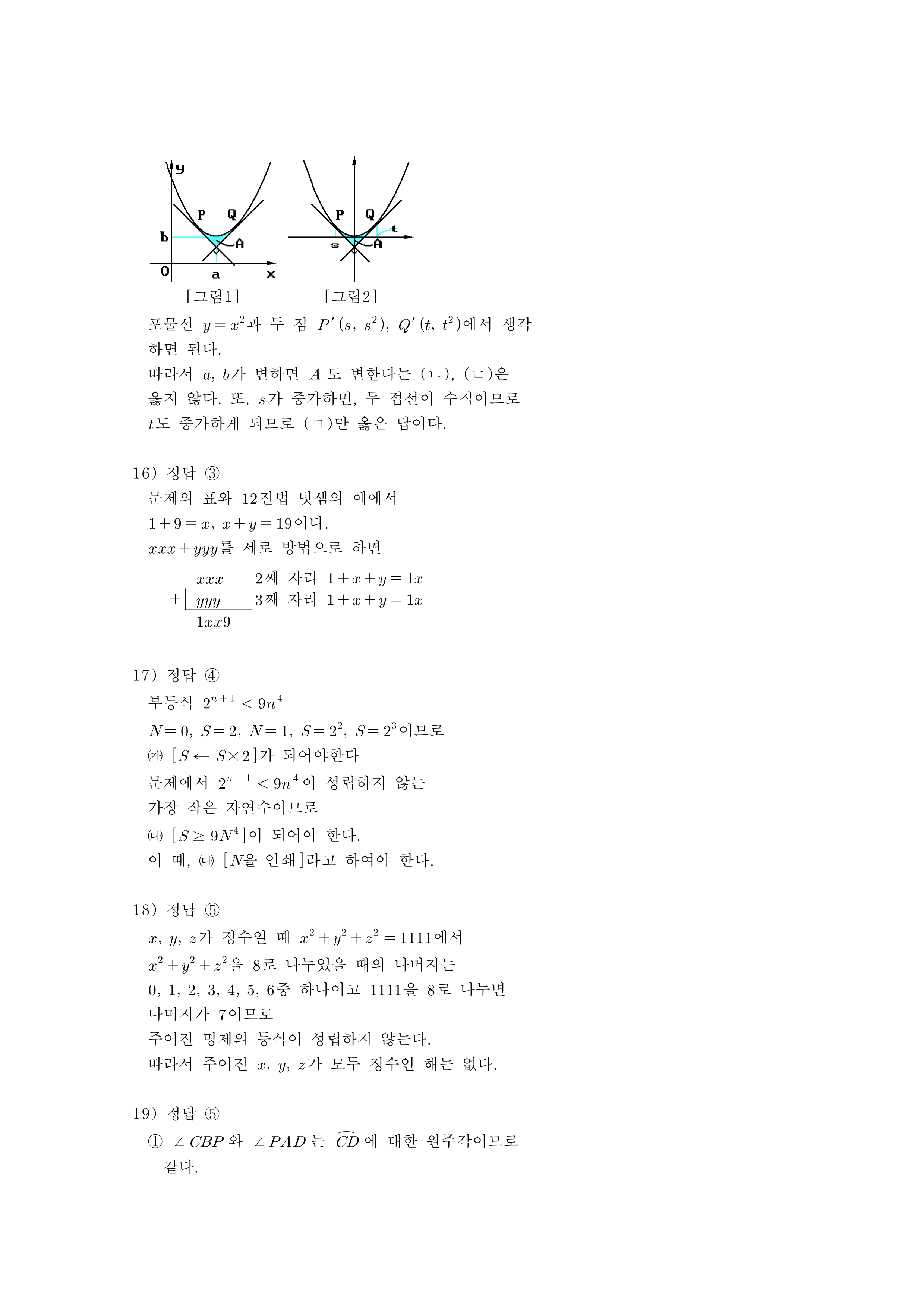 15. 포물선 $y=(x-a)^{2} +b$ 위의 두 점 $P(s+a, s^{2} +b)$와 $Q (t+a, t^{2} +b)$에서 각각 그은 이 포물선의 접선은 서로 수직이다. 이 두 접선과 위 포물선으로 둘러싸인 도형의 넓이를 $A$라고 하다. 다음 [보기] 중 옳은 것을 모두 고른 것은? (단, $s < 0 < t$)