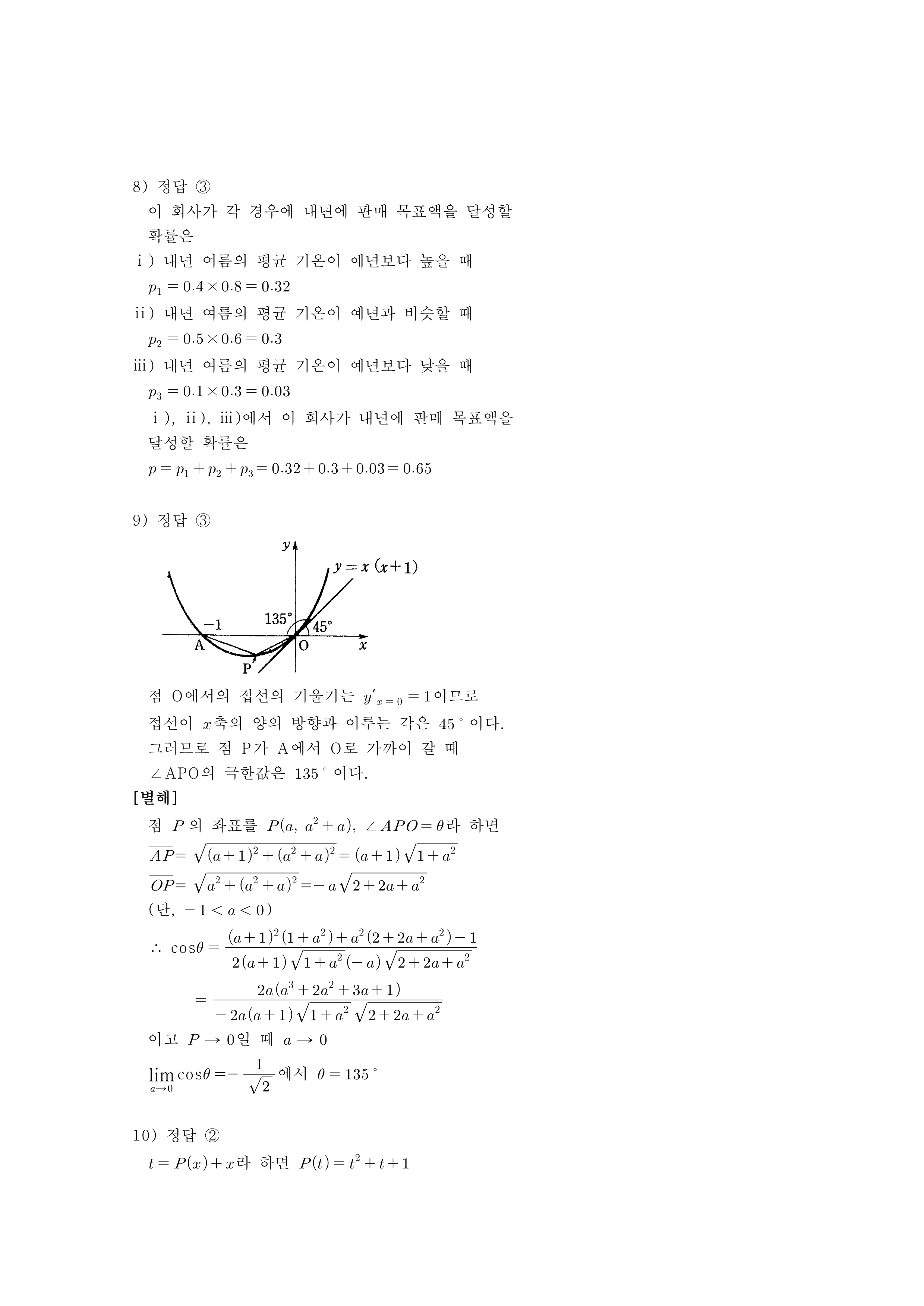 9. 포물선 $y=x (x+1)$ 위에 점 $A(-1, 0)$이 있다. 점 $P$가 점 $A$에서 포물선을 따라 원점 $O$로 한없이 가까이 갈 때, $\angle APO$의 크기의 극한값은?