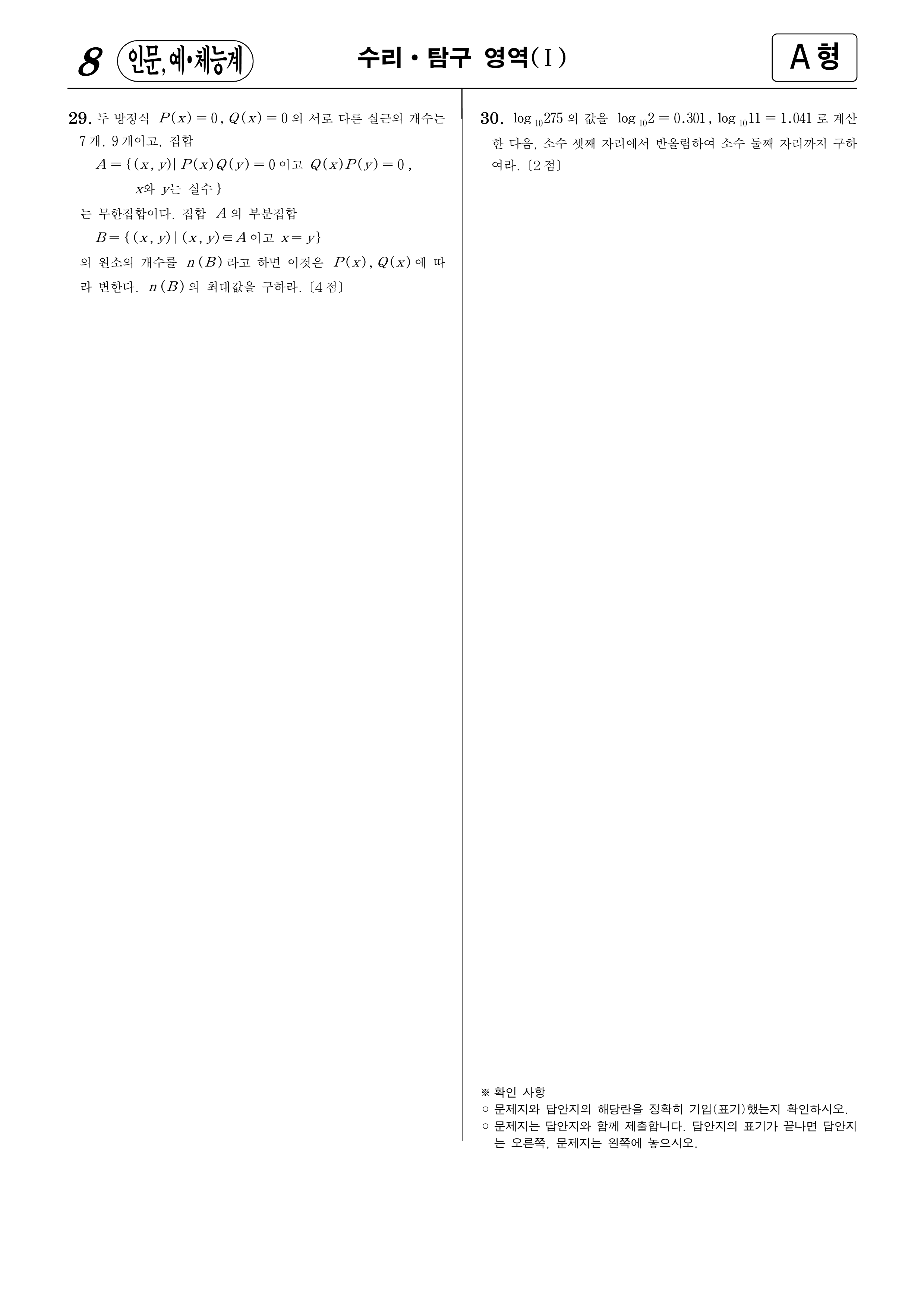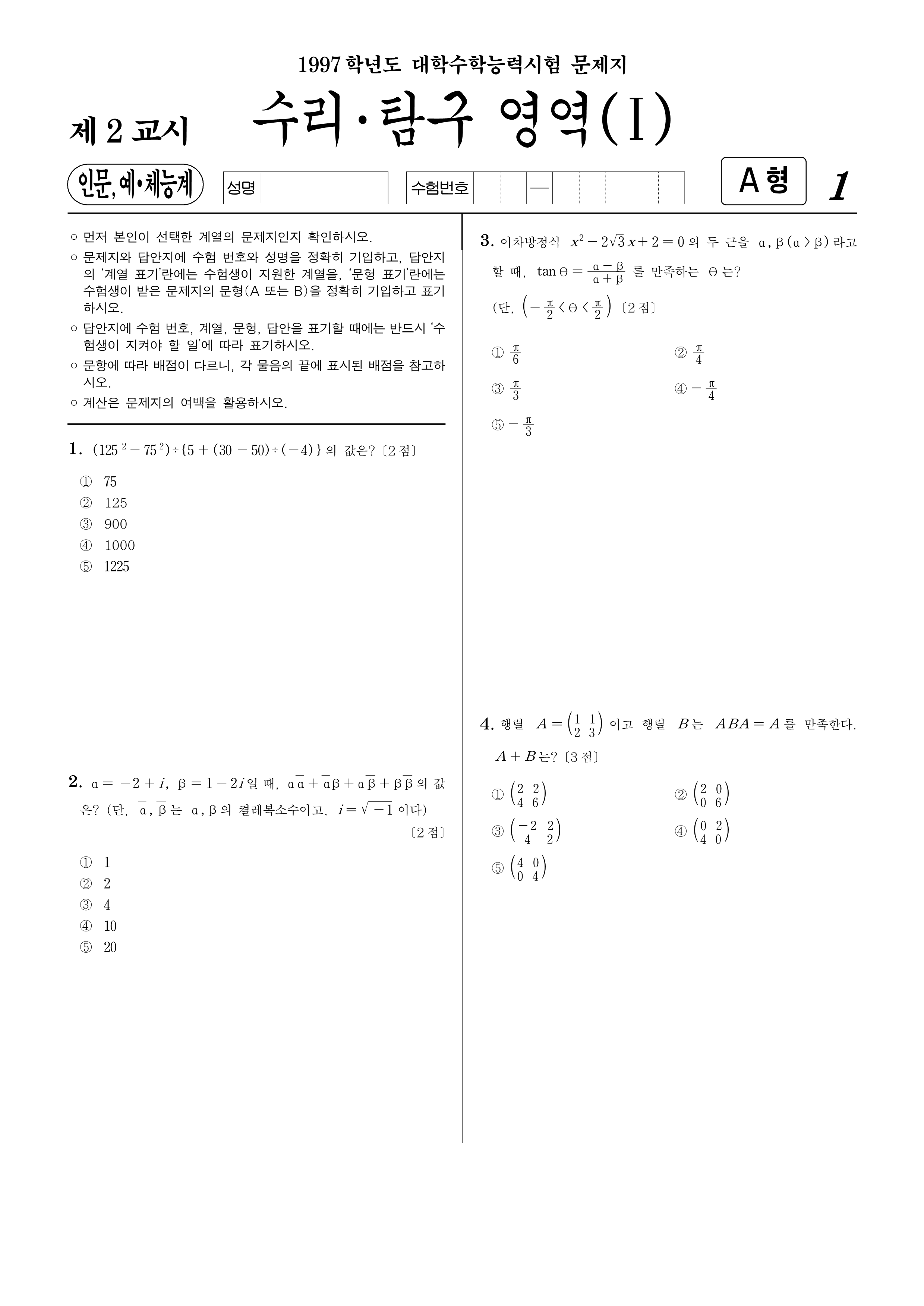 1997학년도 대학수학능력시험 수학(인문,예체능계)