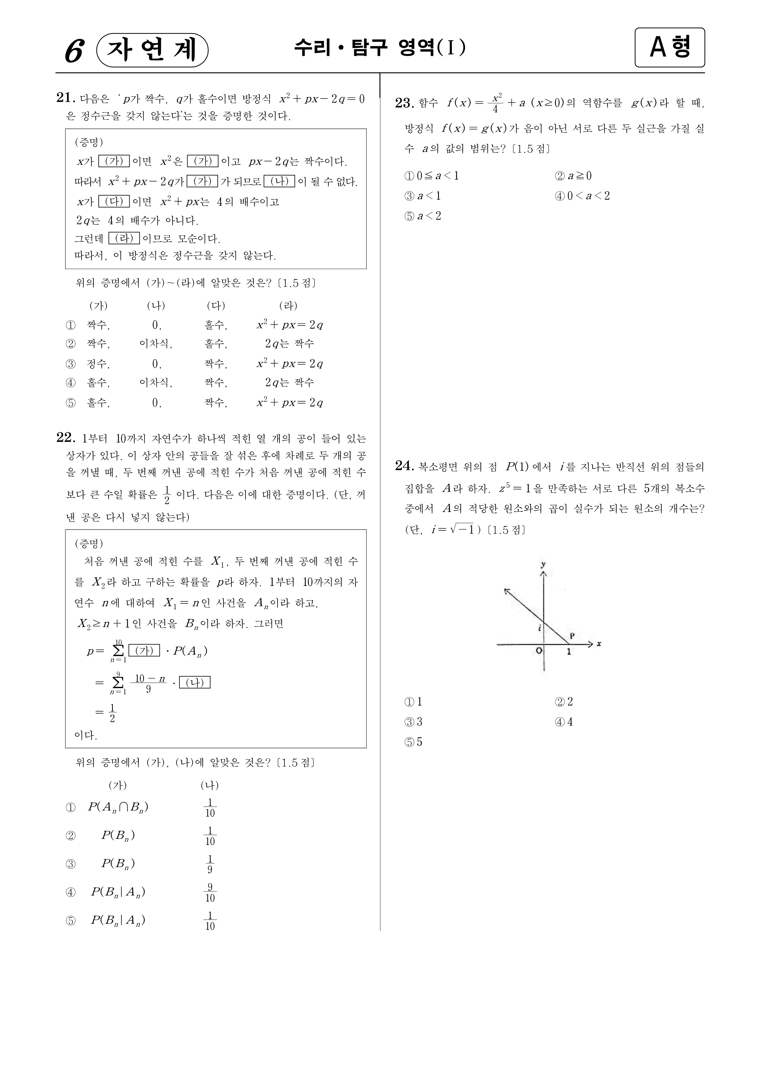 그러면 $p= \displaystyle\sum_{n=1}^{10} \fbox{ ㈎ }\cdot P(A_{n})= \displaystyle\sum_{n=1}^{9} \dfrac{10-n}{9} \cdot \fbox{ ㈏ }= \dfrac{1}{2}$